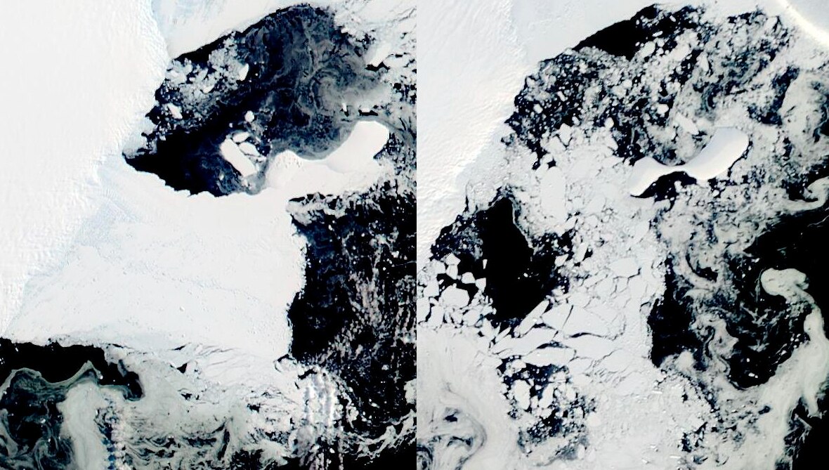 Massive Antarctic ice shelf collapses amid unusually... | Globalnews.ca Complete collapse of East Antarctica's Conger Ice Shelf (~1200 sq. km) ~March 15, seen in combo of #Landsat and #MODIS imagery. In February, the Antarctic sea ice annual maximum extent — or the total area covered by some amount of ice, including open water between ice floes — reached a low.